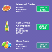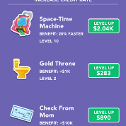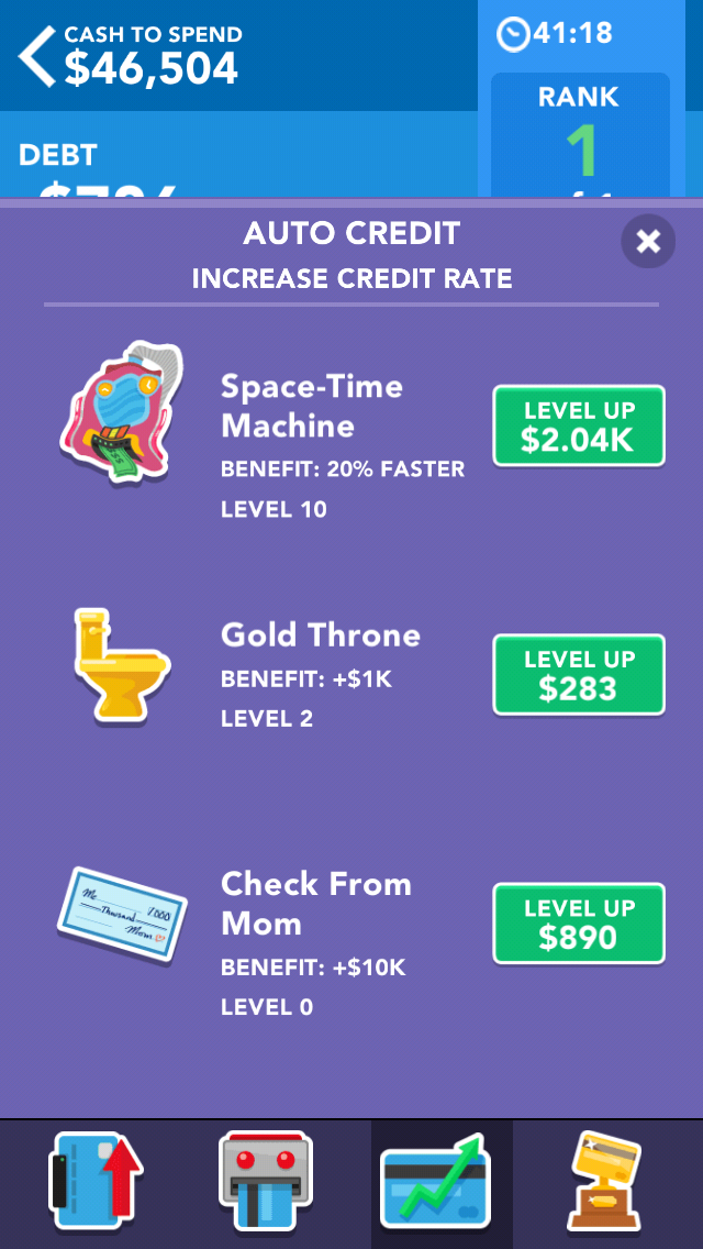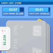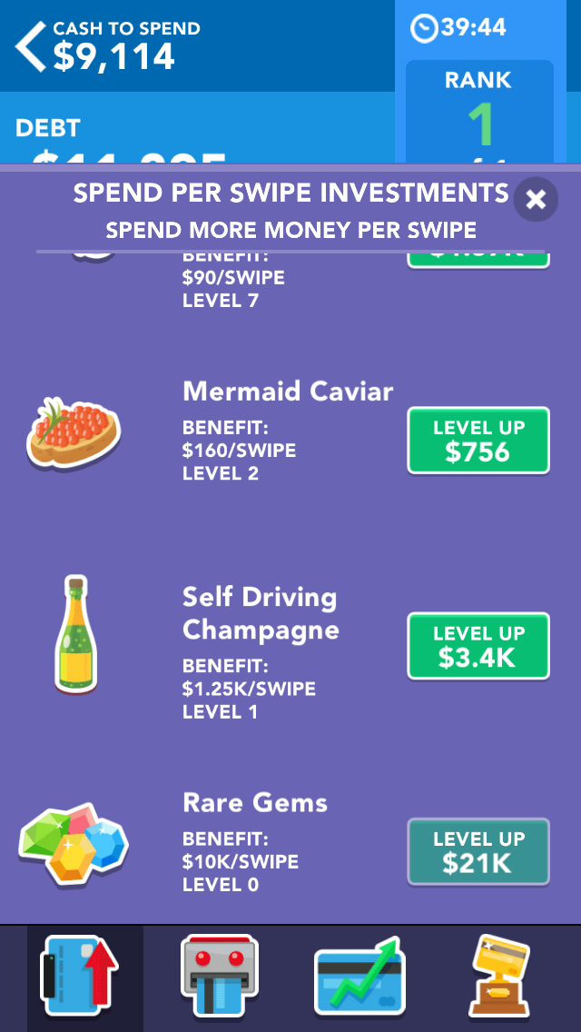 The new Make it Rain tournaments are a competition to see which player can rack up the most debt in the shortest amount of time, resembling a Brewster’s Millions contest, though winners are more likely to spend quintillions than millions. Players swipe a credit card and compete to rack up the most debt before the tournament ends. Players purchase various luxury items such as Emerald Sunglasses, Self Driving Champagne, a New Identity, a Radioactive Island, a Rigged Election etc. These purchases increase their credit limit, help them grow debt faster, and move up the ranks.