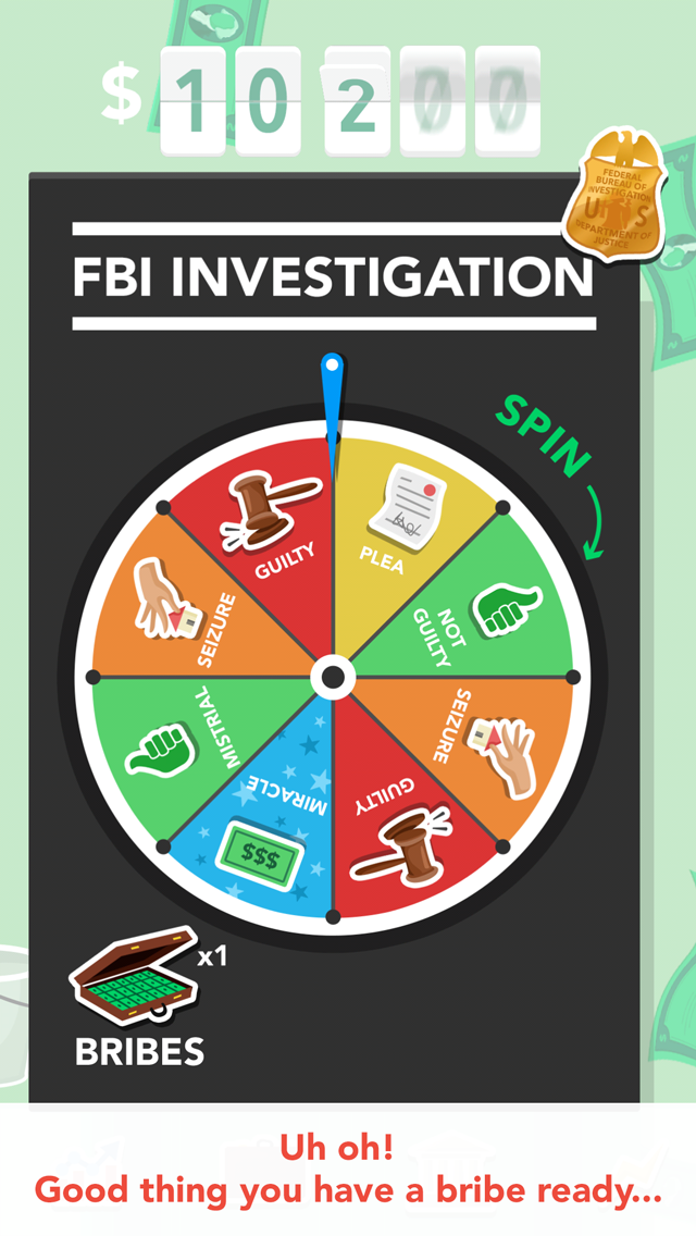 These Make It Rain moguls are under constant threat of FBI investigation. Users are “indicted” often and forced to spin the FBI investigation wheel. “If convicted, you might lose half your fortune,” says Segall. “You hope for a mistrial. Or you can always get out of it by using ‘bribe cards.’” The app makes money by showing ads and by selling virtual items. The most popular item is “1 pack of 5 bribe cards,” for 99 cents.