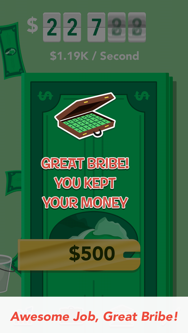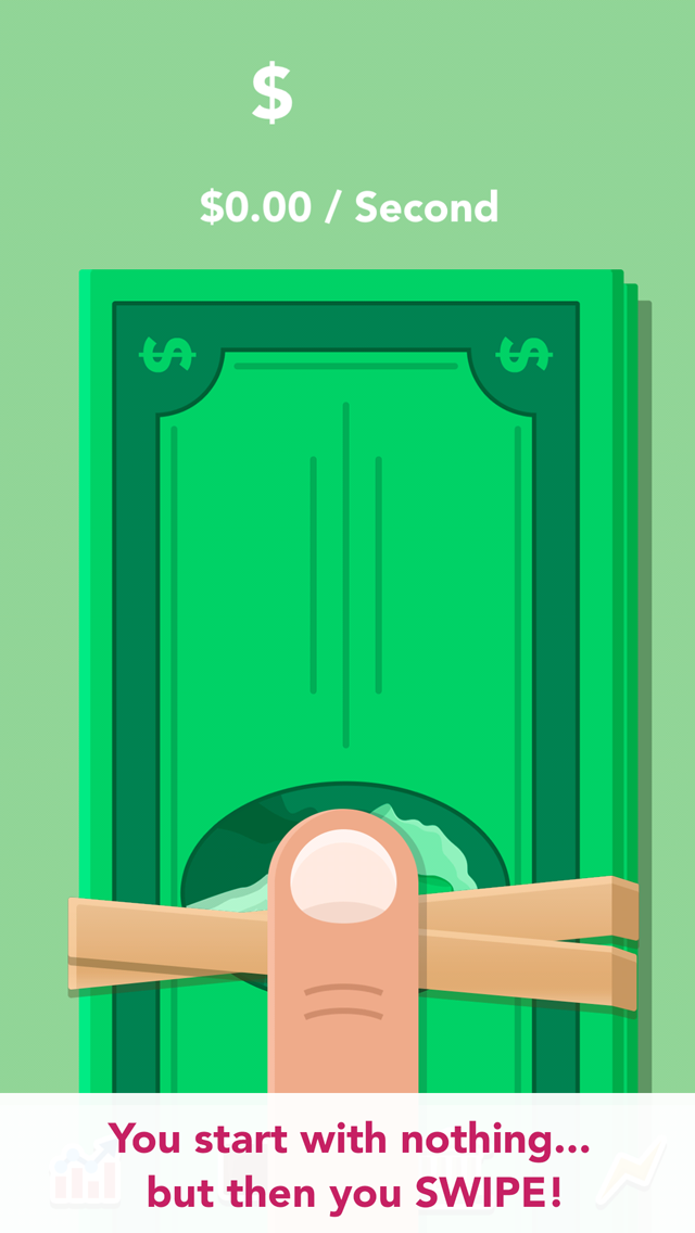 Here’s how Make It Rain works: users swipe a stack of dollar bills to earn money. They can use earnings to make various “business,” “financial,” and “political” investments that allow them to earn faster. Lower level players might run for class president or hire a PR firm as a political investment, but advanced users make voting machines and bribe federal judges.