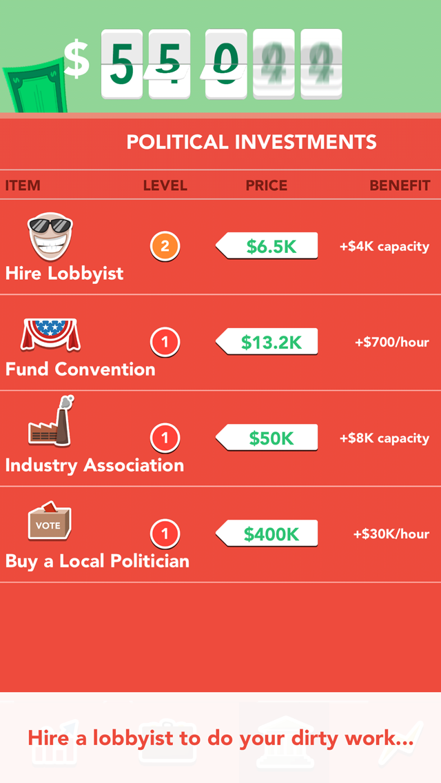 Make It Rain isn’t just a game. It’s a satire about wealth obsession and what it takes to become obscenely rich. Players manipulate business, political, and financial institutions to generate incredible fortunes. It’s striking a nerve in political discussions of wealth inequality and political corruption in the US.
